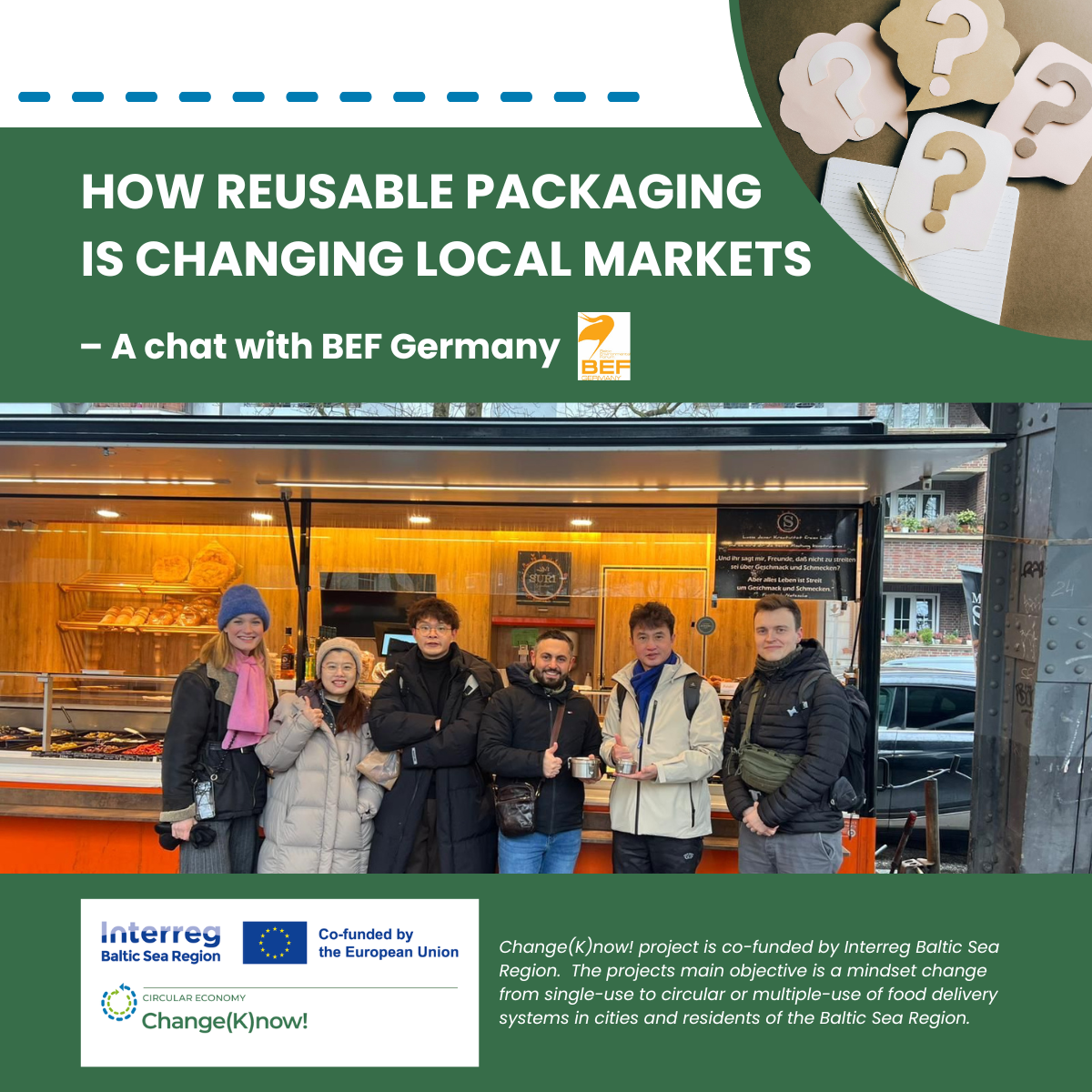 Change(K)now! rethinks food delivery systems - shifting from single-use to reusable options and crockery. It targets municipalities, public institutions, food delivery companies, and consumers. Together, they can drive more circular systems by adopting practical solutions and changing daily habits. While circular options exist, they’re scattered, rarely tested beyond isolated cases, and not tailored or promoted widely enough to gain broad support. Change(K)now! bridges this gap by: a) developing prototypes, b) testing in real-life settings, and c) improving circular solutions for easier adoption.